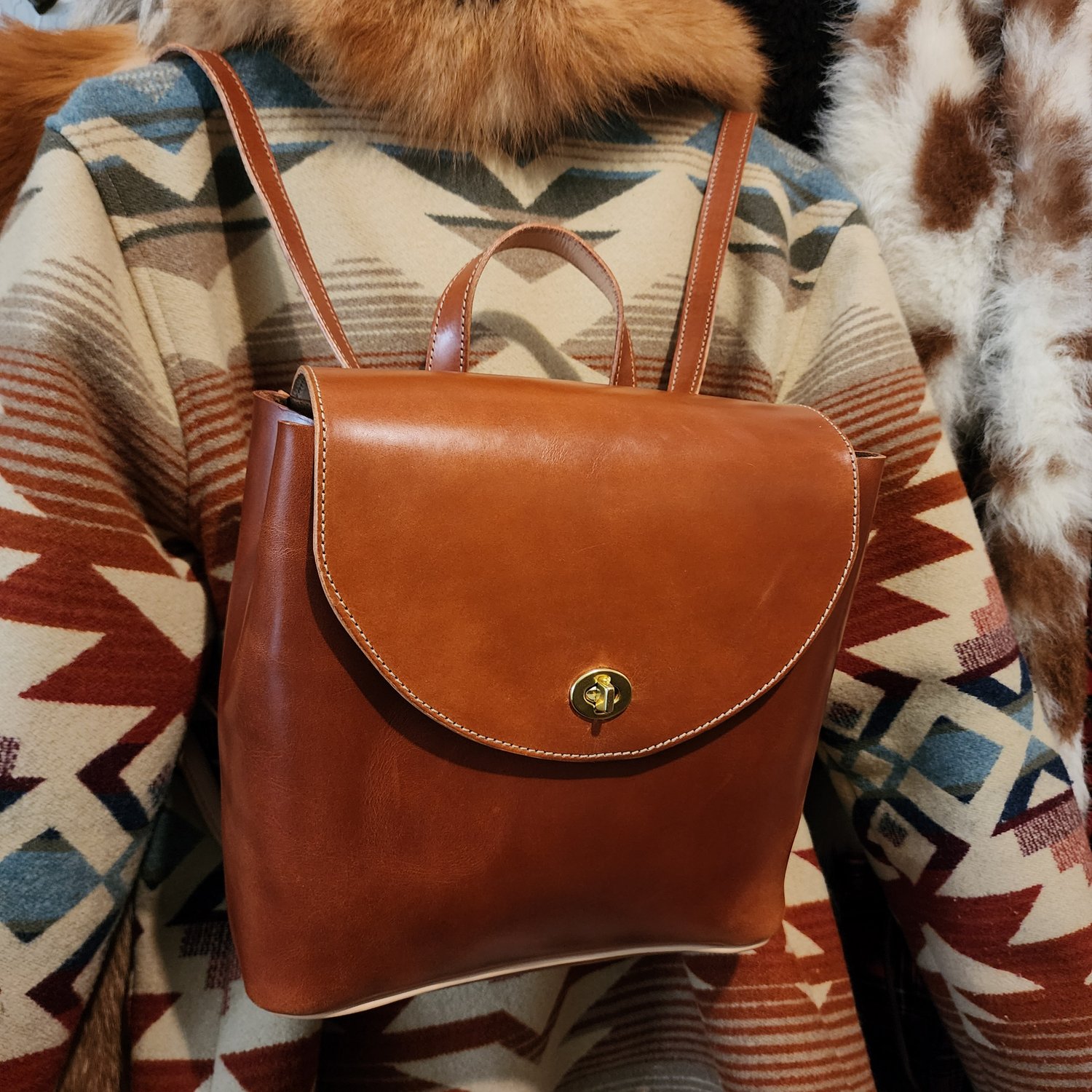 This fun little backpack converts to a crossbody/shoulder carry! Made from gorgeous, firm, vegetable tanned English bridle leather with contrasting natural piping, lined straps & flap. It closes with a brass turn lock. Inside is unlined with a pocket & an adjustable strap to keep contents secure.